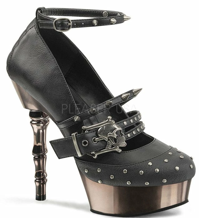 | 5 1/2″ (14cm) Finger Bone Heel, 1 1/2″ PF Double Strap Maryjane Pump w/ Stud, Spike, and Skull Buckle Details and Pewter Chrome Plated Bottom (MUERTO-680) |