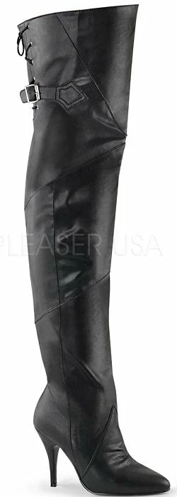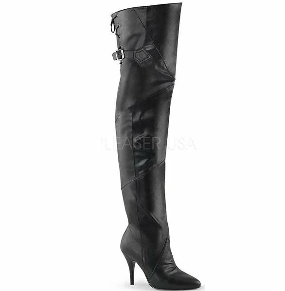 4″ (10cm) Heel, Thigh Boot Pull-On Featuring Buckle and Lacing Detail.